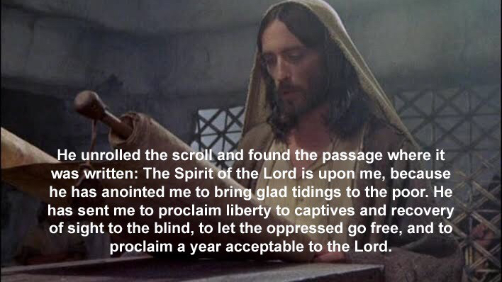 The second part of the gospel for today is about an event in Jesus’ life that would signal the start of his ministry. Every male Jew, upon reaching the age of 13 makes him a part of the Jewish adulthood and could now publicly read the Jewish scriptures in the synagogue. So Jesus as part of this custom stood up to read a scroll from the prophet Isaiah. He read the part that was written: “The Spirit of the Lord is upon me, because he has anointed me to bring glad tidings to the poor. He has sent me to proclaim liberty to the captives and recovery of sight to the blind, to let the oppressed go free, and to proclaim a year acceptable to the Lord.” Then after reading that he said, “Today this Scripture passage is fulfilled in your hearing.”